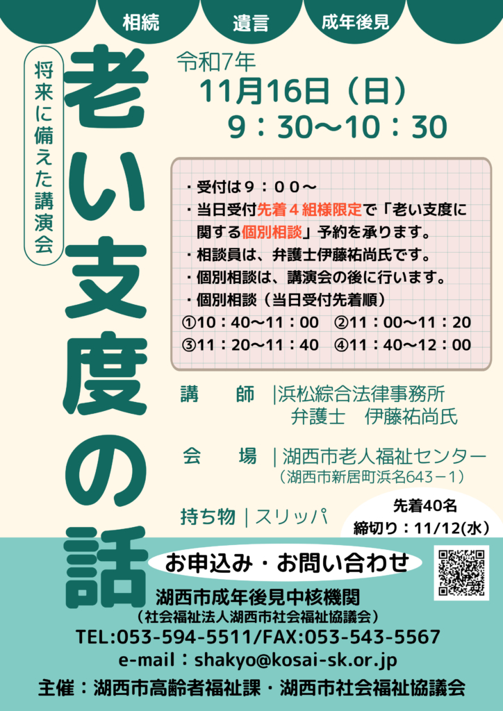 ※なお、当日受付(9:00~)で先着4組様 老い支度に関する個別相談の予約を承ります。
